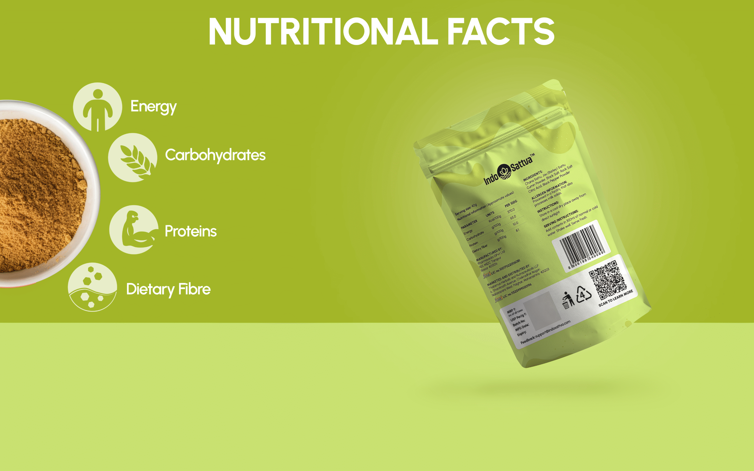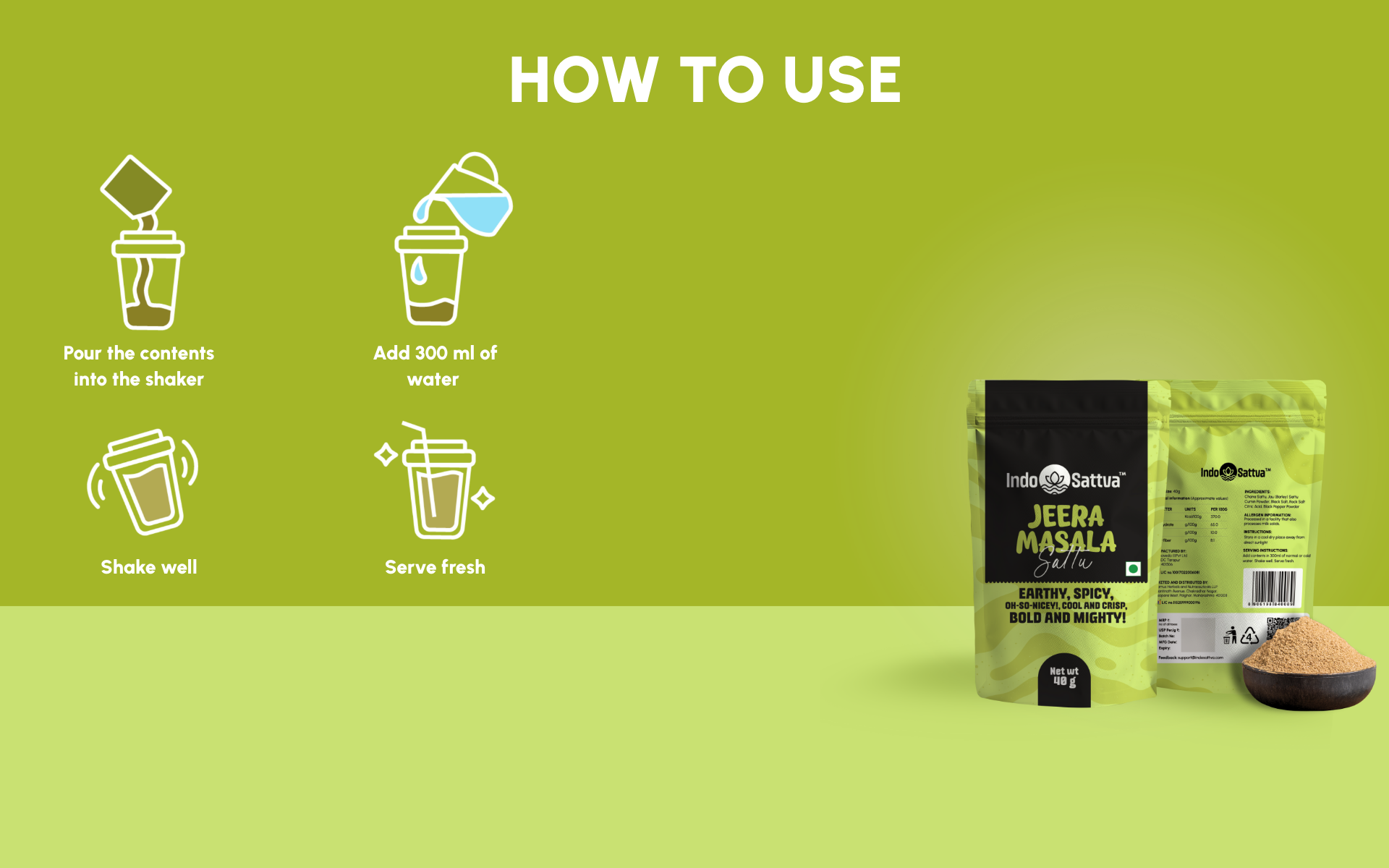 To make, add the 40g pack to ~300 ml water, stir or shake, and serve. Want it extra lively? Add ice and a squeeze of lemon. The layered spice profile complements the nutty base of roasted chana and barley sattu, giving you a drink that’s not just tasty but also nutrition-forward with plant protein and fiber.